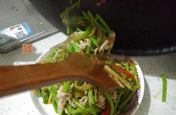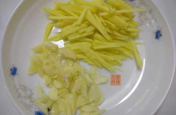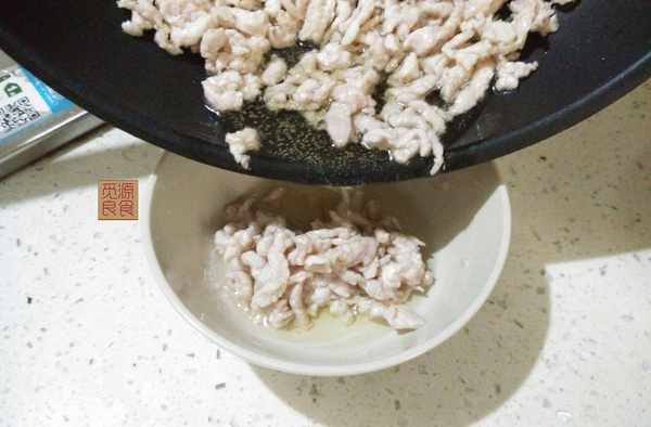 熱鍋起油,先炒肉絲,將剛剛用生粉和色拉油醃制的肉絲下鍋炒制,炒制七成熟的樣子,裝盤待用。