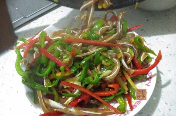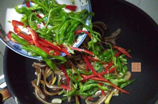 同時放入剛剛準備好的青椒絲和青紅椒絲,剛剛準備的很多,放入一小部分就夠瞭,不要太多