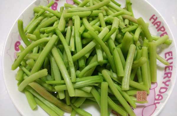 將莧菜菜梗摘成一段段的,洗凈待用。準備生薑薑絲和大蒜蒜粒。