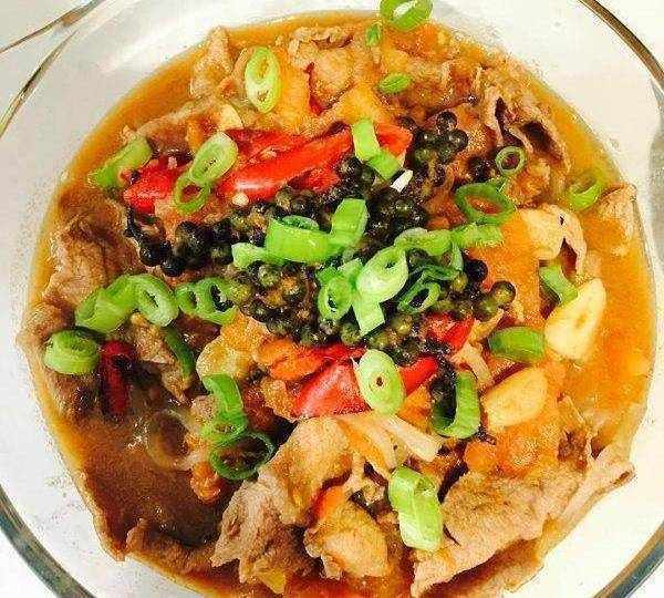 6.撈出肥牛,撒蔥花,點綴藤椒。