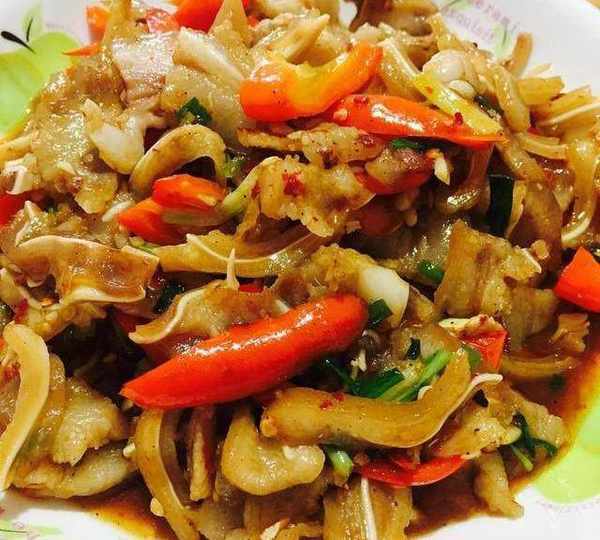 用料: 尖椒1個、豬耳朵2個、紅椒1個、食鹽1/2茶匙、薑1塊、蒜2瓣、八角1顆、花椒1/2茶匙、桂皮1段、香葉1片、茴香籽1/2茶匙、植物油1湯匙。