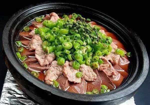 2、鍋裡摻入專用香湯汁,把已汆熟的牛肉和血旺放進稍煮後,再放芹菜節、蒜苗節和木耳拌勻,出鍋裝在烤燙的石鍋裡並撒上青椒圈即成。