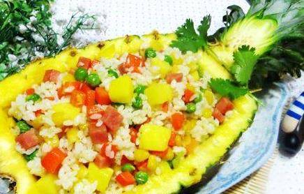 菠蘿飯的制作方法,菠蘿洗幹凈,切一半,用小刀劃開菠蘿肉,然後用勺子把菠蘿肉挖出來待用。火腿,菠蘿,切大小等同的小丁,蔥薑蒜切末待用。鍋內熱油,薑末蒜末下鍋翻炒,米飯下鍋,轉小火慢慢炒散,轉中火,加火腿腸,放鹽適量,菠蘿丁下鍋,轉大火,把米飯炒幹點,最後放雞精出鍋,把炒好的菠蘿飯裝進提前準備好餓菠蘿殼裡,一份色澤鮮亮,美味可口的菠蘿飯就做好啦!