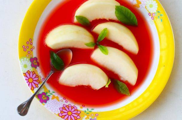 蜜桃西瓜甜湯:將水蜜桃去皮去核後切牙,西瓜去皮後切小塊。 將西瓜塊放入破壁機料理桶,放入1大勺砂糖;將料理桶放在破壁機上;選擇1檔,打成西瓜汁;切好的蜜桃放入盤中,西瓜汁過濾後倒入盤中,冷藏半小時吃更好,夏天來上一杯,太舒服瞭。