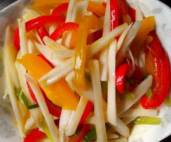 五彩椒拌藕絲:把藕削皮,洗凈切成1厘米寬的長絲用水浸起,免得變色。兩種椒切粗絲,大蔥葉1根也切絲,鍋裡燒水,水開後把藕、兩種椒一起放在水裡燙個2分鐘撈出,放入盆子裡,再放入蔥葉絲、橄欖油、鹽、白糖,一起和均勻,裝盤即可,五彩斑斕的。