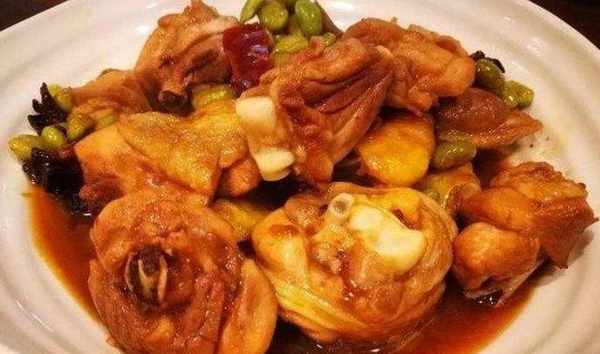 毛豆燒雞:1、雞肉用鹽醃制五分鐘,過油去一下血水,起油鍋,放入八角幹辣椒炒香,2、倒入雞肉,加生抽老抽鹽和冰糖。3、翻炒上色差不多2兩三分鐘。4、倒入毛豆翻炒後加入少許水,蓋蓋燜煮10~15分鐘湯汁濃稠即可。