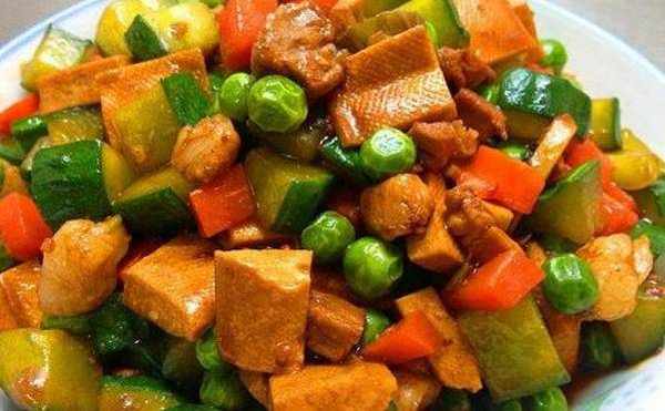 炒三丁:1. 蔥薑切碎,蒜切片2. 五花肉切丁3. 胡蘿卜切丁4. 豌豆5. 豆腐幹切丁6. 黃瓜切丁7. 鍋內放油煸香蔥薑蒜下入豬肉丁炒制斷生後放入老抽給肉丁上色,然後依次下入豌豆丁,胡蘿卜丁豆腐幹丁和黃瓜丁煸炒。下入少許生抽提味,少許糖提鮮。出鍋時下入少許水淀粉勾芡,即可出鍋裝盤。