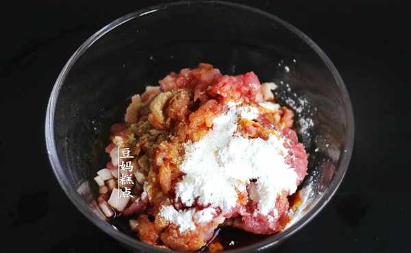 3、肉末中加入3蓋生抽(就是生抽瓶子上的蓋子)、1撮白糖、1勺淀粉、適量黑胡椒粉
