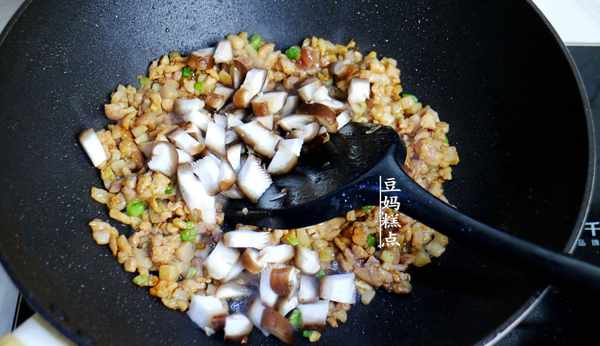 6、放入香菇丁一起翻炒均勻。
