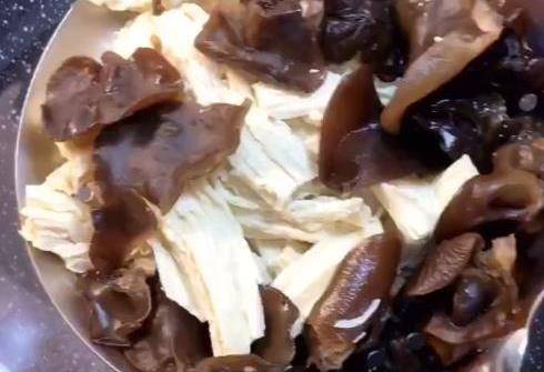 泡好的腐竹和木耳用水煮5分鐘,煮熟,撈出,放入盤中。