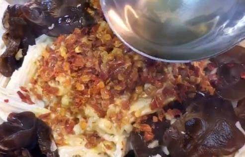 盤中放入大蒜末,粗辣椒面,澆上熱油。爆香。