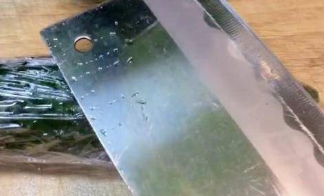 準備一根烏漆麻黑的黃瓜,包上保鮮袋,用刀拍扁,給它切成小段。