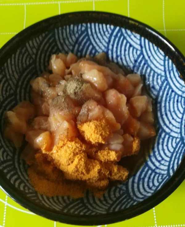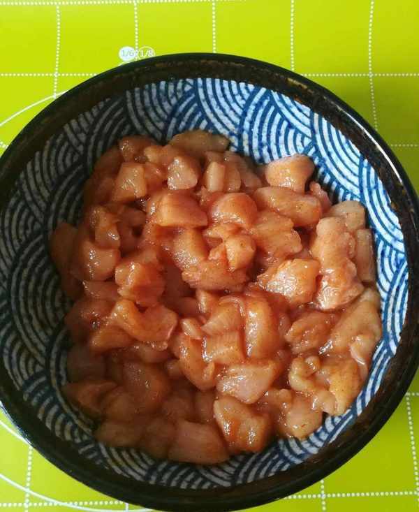 第一步:將雞胸肉切成丁用鹽、料酒、胡椒粉、奧爾良醃料醃制15分鐘,讓它充分入味