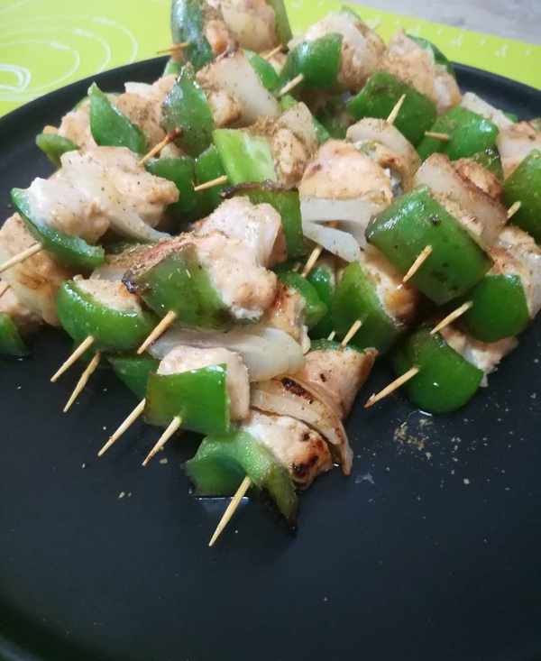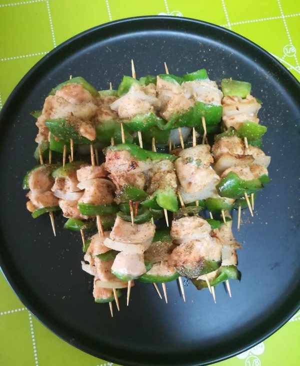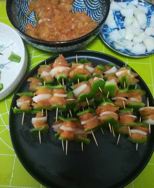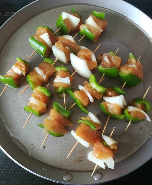 第三步:用牙簽把洋蔥和青椒,雞肉塊穿起來(如圖)