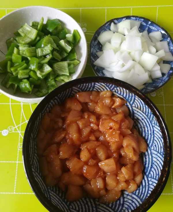 第二步:準備配菜(青椒,洋蔥切成小塊,如圖)
