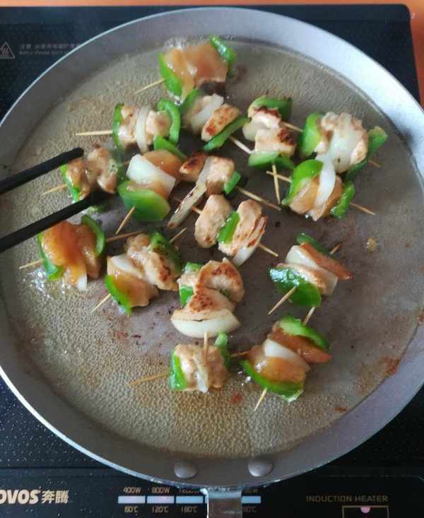 第四步:平底鍋裡加少許油,放入雞肉串小火煎制,煎至雞胸肉變色微焦