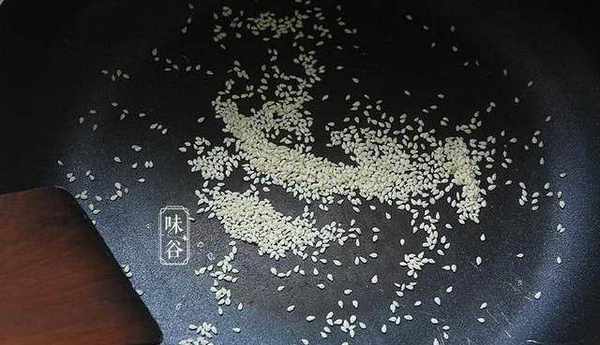 2、準備1小勺芝麻,中小火炒個3分鐘,炒出香味就可以瞭,放著待用。