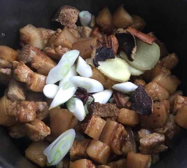 第7步、放入五花肉翻炒均勻,加入蔥薑和大料。
