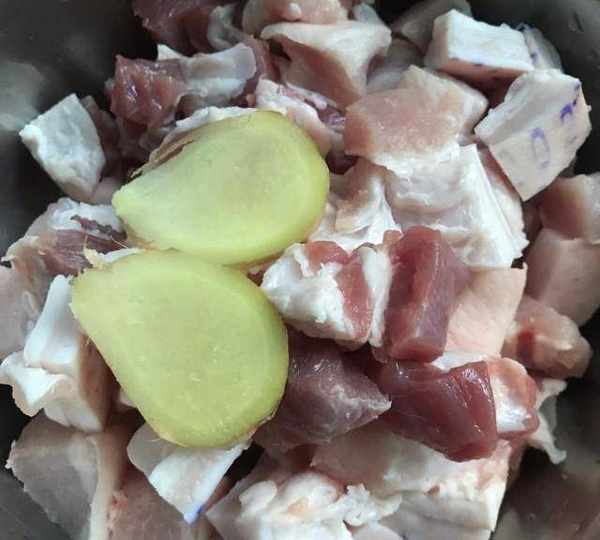 第2步、五花肉洗凈切大塊,放入薑片準備焯水。