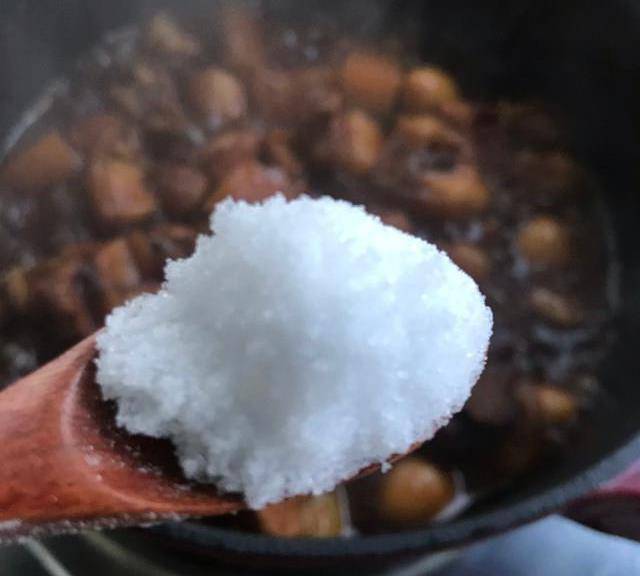 第6步、鍋中入油燒熱放入冰糖炒至糖色。