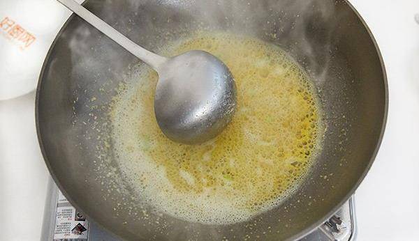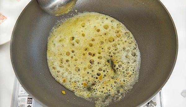 4.鍋上火,放入底油,油熱以後下入咸鴨蛋黃,先放大約50g。