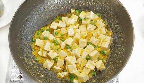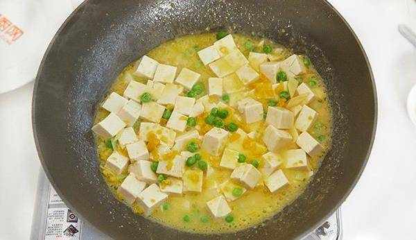 6.這時把豆腐倒入鍋中,加入濃湯寶半塊,小火燒兩分鐘。再放入剩下的咸蛋黃20g,這樣燒制豆腐的顏色會更好看。 而且我們放鹽的時候一定要少放 控制好鹽的量,因為咸蛋黃就是咸的。