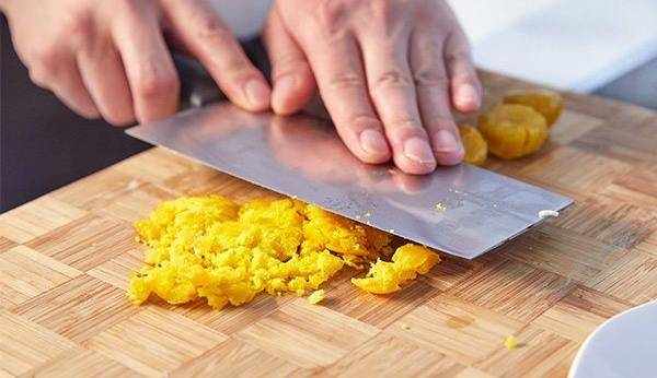 2.水燒開後,把嫩豆腐倒入鍋中,焯水,去掉豆腐的豆腥味。放鹽10g,讓豆腐在燒制時更好的入味。把咸鴨蛋黃提前上蒸鍋蒸10分鐘,去掉蛋黃的腥味。刀面輕壓蛋黃,把蛋黃碾碎。把焯過水的豆腐撈出備用。