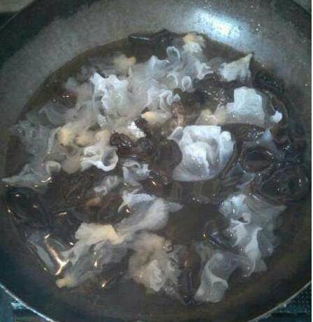 鍋裡加水,等水開,放入木耳,銀耳,燙一下,撈出