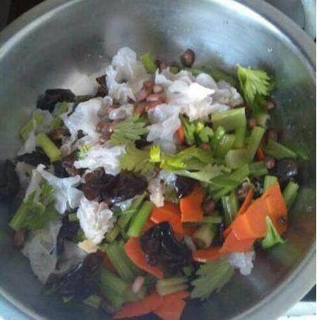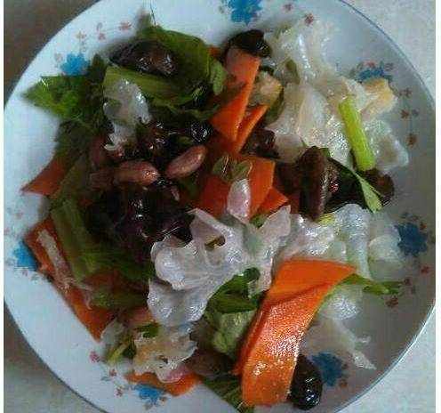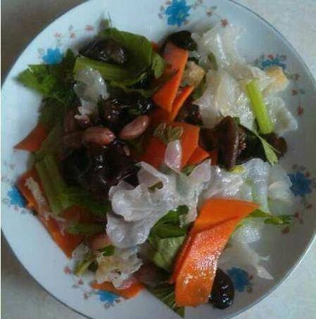 夏季氣候幹燥,最適合吃些新鮮蔬菜瞭,記得小時候最愛吃的就是媽媽做得素色什錦菜,現在把這道菜和大傢分享一下!先說一下食材:黑木耳,銀耳,花生米,胡蘿卜,芹菜。