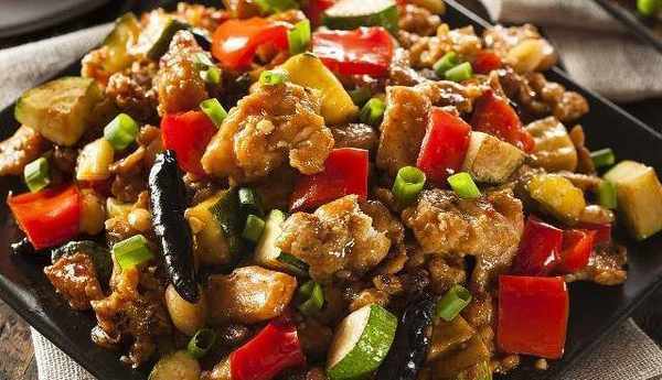 4.放入雞丁炒至變色,加入蔥薑蒜,青紅椒丁,翻炒;