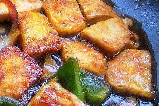 3.熱油鍋,裹勻蛋液的豆腐放入鍋裡煎至表面金黃(嫩豆腐非常嫩,所以翻面的時候一定要小心),煎好的豆腐盛出備用;
