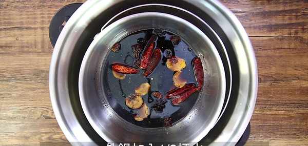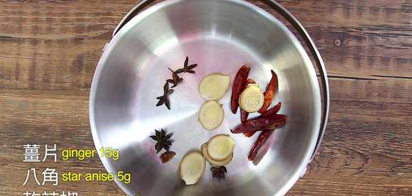 步驟1:準備一個鍋,先放入幹辣椒,八角和薑片。