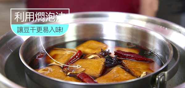 步驟1:小豆幹洗凈後先用熱水汆燙,再撈起瀝幹後倒入鹵汁內。