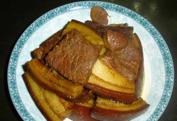 香鹵豬肉:豬肉切大塊焯水備用,鍋內加入適量的水,放入焯水好的豬肉塊,加入適量的生薑片、辣椒、桂皮、八角、白糖、黃酒、鹽。開大火煮開轉中火,悶煮約一個小時,關火悶兩小時即可食用。