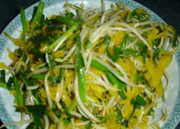 辣包菜炒綠豆芽:辣包菜洗凈切斷,綠豆芽洗凈備用,韭菜洗凈切斷備用。鍋內加入適量食油,開大火,倒入辣包心菜翻炒,加入綠豆芽翻炒。加入適量的鹽,然後加入韭菜斷快速翻炒到熟,放入適量的味精、胡椒粉拌勻即可。