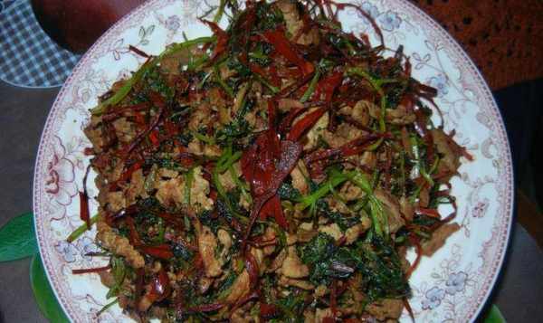 香辣肉絲:香菜切段,裡脊肉切成細一點的肉絲,蔥薑蒜切碎一些再切成絲一些油熱下碎的蔥薑蒜,然後下肉絲翻炒變色,下辣椒絲和蔥薑蒜切成絲的那些,翻炒幾下放入香菜,然後倒老抽,雞精,鹽,五香粉,味素。出鍋即可。