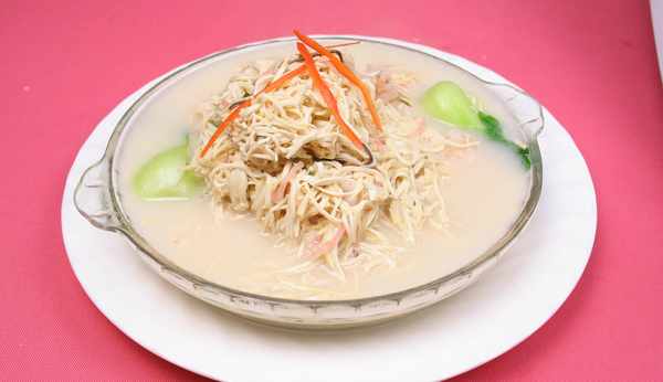 主料:幹絲200克。輔料:香菇(幹)15克,火腿10克,雞20克,雞胸脯肉20克,蝦幹5克。調料:食鹽2小勺,雞湯500克,白胡椒粉1小勺。味道醇厚,營養豐富,鮮爽無比的佳肴。