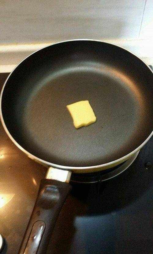 首先要用的工具就是平底煎鍋。把平底鍋加熱後放入黃油,要把黃油滿滿的焊化,均勻的平鋪在平底鍋裡。當然這時候的火一定要調好,不要太大也不要太小。微火就行。