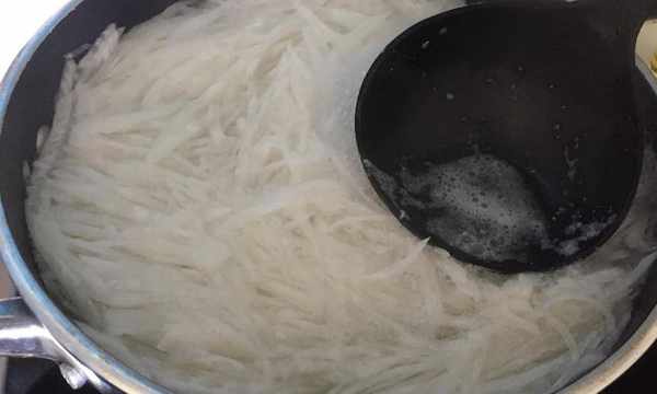 4、再將蘿卜絲放進去煸炒幾下,然後加入開水,要沒過蘿卜絲的量,加入適量的食鹽和雞精。