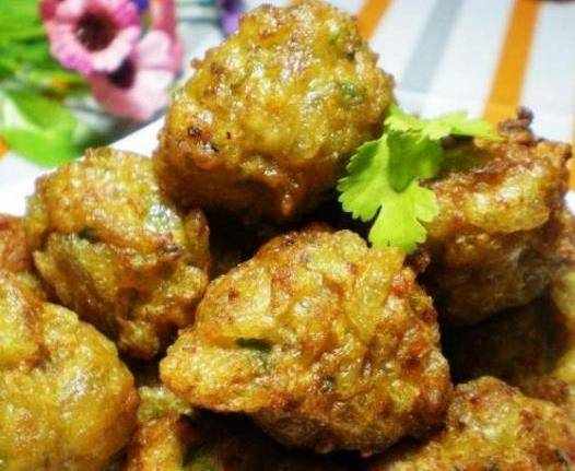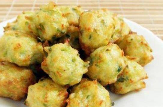 6、現在我們就可以團丸子瞭,用手抓一團面糊,然後用虎口處擠出丸子來,這樣丸子比較遠圓,而且也很方便。之後用勺子下到鍋裡,依次這樣做好就可以瞭。