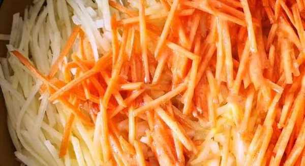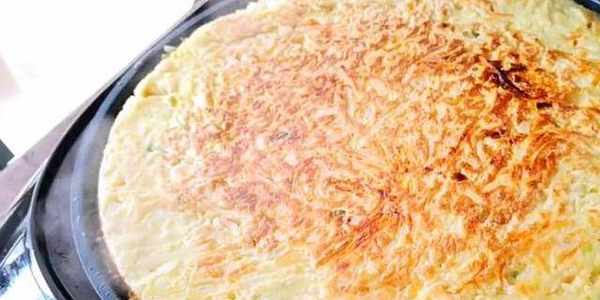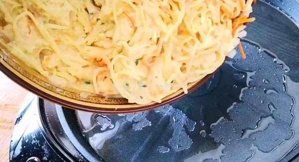 土豆去皮切絲,搓好絲後將土豆泡在水中,防止氧化發黑。取一個洋蔥先切成絲,再切成洋蔥碎。土豆絲控水後撈出放入盤中,再將切好的洋蔥碎也放入盆中。如果傢裡有胡蘿卜的話,再搓一塊胡蘿卜放進去。碗中打入三個雞蛋,將蛋液攪散。再將打好的蛋液倒入盆中。加入一點蔥花,一雙眼少許胡椒粉,稍微攪拌一下。