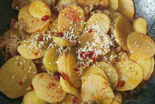 再倒入土豆片大火翻炒,炒的時候淋入適量的水,防止醬料粘鍋出糊味,土豆變色,加入適量的鹽、老抽和水大火翻炒均勻。再加入炒香的辣椒粉、孜然粒、蔥花、白芝麻大火翻炒均勻,加入適量的水,抖鍋翻炒,讓香料黏在土豆片上,關火即成。