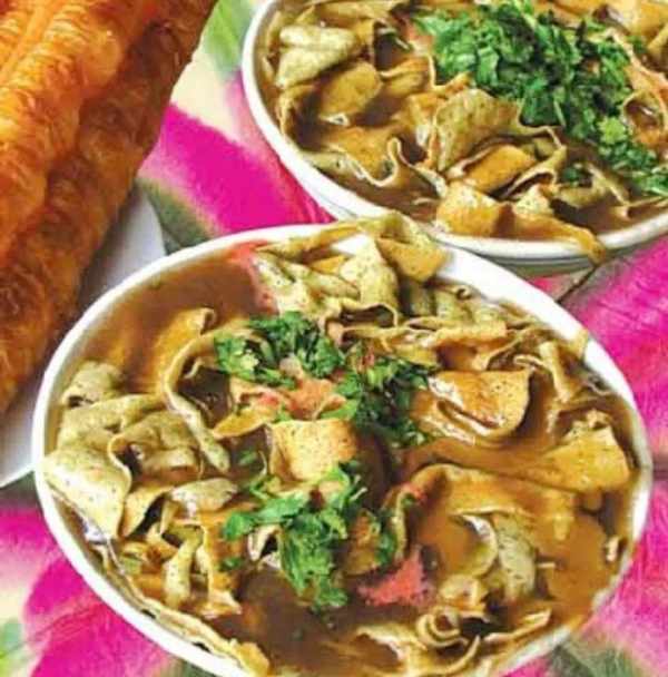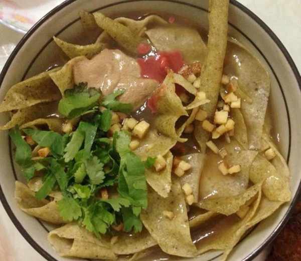 6.食用時將嘎巴投入鹵汁拌勻,酌加腐乳汁、辣椒油、香幹片、芝麻醬、香菜末即可。