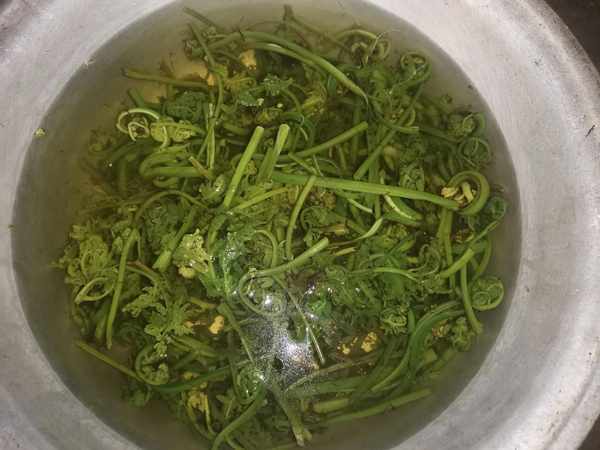 除瞭用清水洗幹凈,還要把一些沒有長開的蕨菜,把毛毛用手去掉,然後再放在水裡面煮。煮熟瞭之後,把蕨菜一分為二,或者一分為四,從中間撕開。