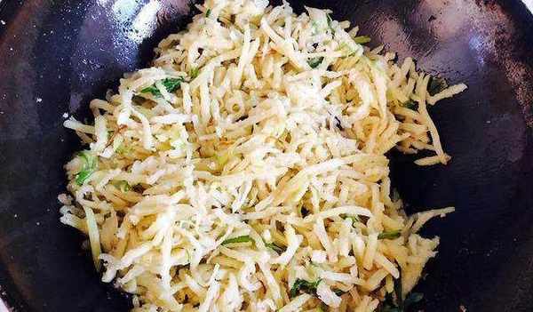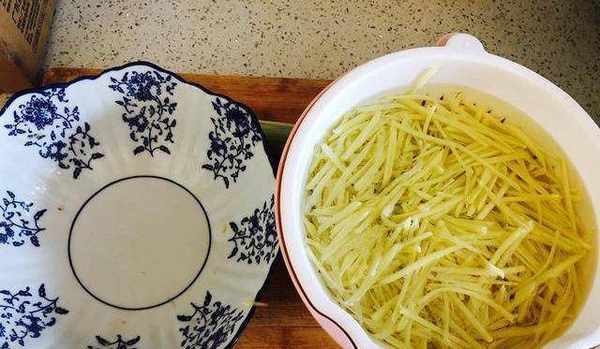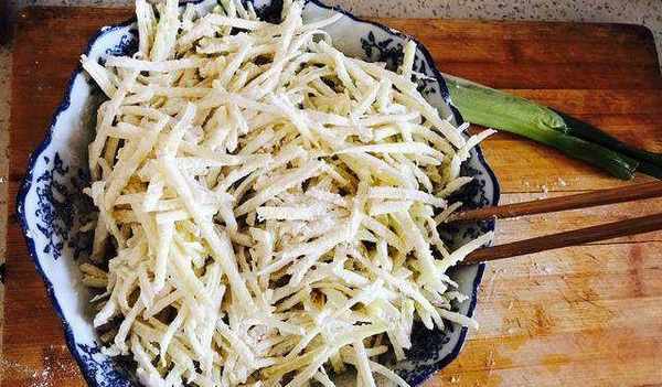 土豆絲涼水過兩編,撈出控水,也不用控太幹凈,待會兒好掛面粉