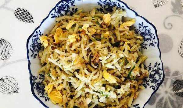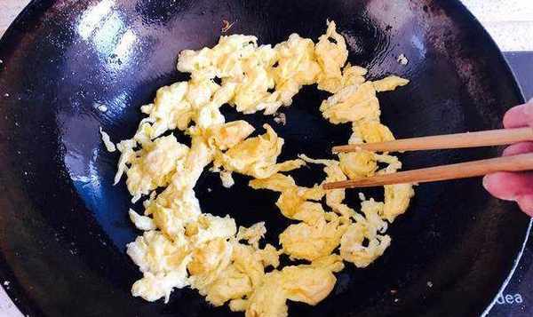 首先先炒雞蛋,用筷子不停的攪拌,讓雞蛋碎一一點,放入碗中備用