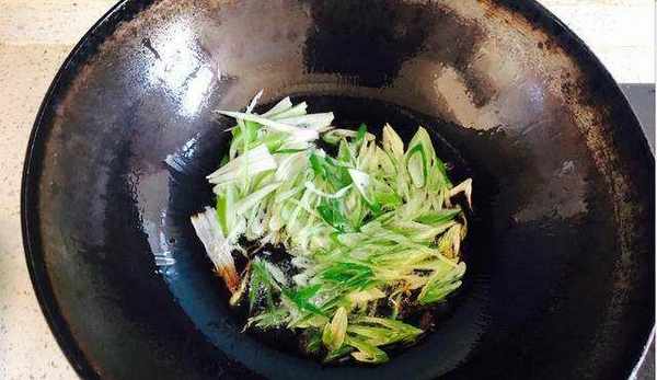 接著炒鍋內放入油,蔥,再加入撥爛子進行翻炒