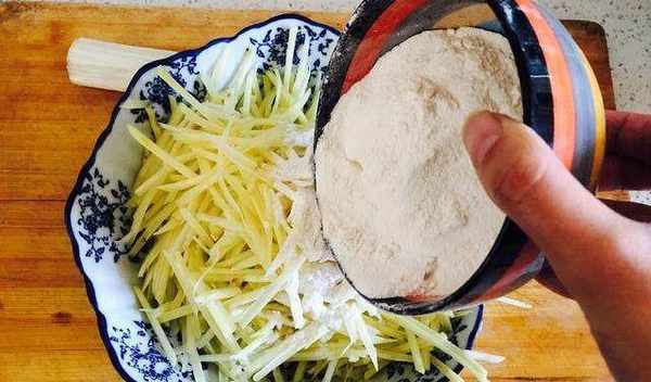 取半碗面粉,將面粉和土豆混合在一起攪拌,讓土豆絲上面沾滿面粉即可