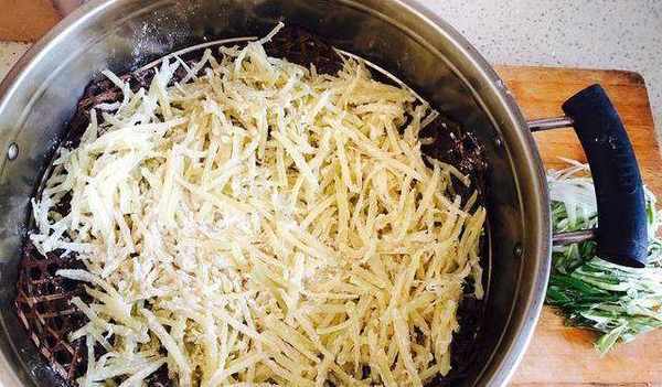 鍋內水燒開以後,把攪拌均勻的土豆絲平鋪在籠裡
