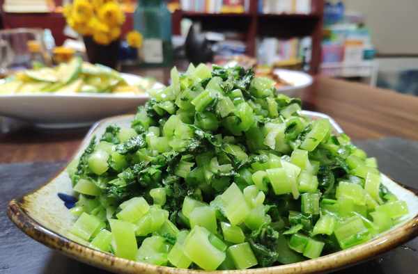 3,燜夠時間的芥菜拿出來切碎,按照喜好加入黃豆醬、醬油、香油就可以直接拌食瞭: